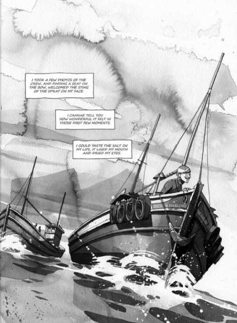Morris is more used to dry land himself. “The closest I’ve ever got is on day-boats line-fishing for mackerel. I relied largely upon books like Angus Martin’s The Herring Fishermen of Kintyre and Ayrshire and Redmond O’Hanlon’s Trawler, oral testimony from the great folk at Ayrshire Archives and a few wise words gleaned from online fishing forums.” Cheltenham-born Morris has moved to Edinburgh but he’s still a Sassanach, so he decided to pluck out only those vernacular words that are distinctly ‘Scots’ rather than trying to reproduce the language intact. Graphically, he has always been interested in the density and atmosphere you can create in black and white, and here he captures the rough waves, changing skies and vulnerable figures almost entirely in surging washes of grey on paper over his taut ink lines. The result is an understated, social-realist evocation of a once bustling industry, now all but vanished. “When you see photographs of those thriving fishing villages full of people and stories, compared to how they look now - very beautiful but very quiet - there is a sadness. You realise how much has gone.”