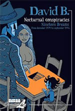 David B. was a founding member of L’Association, a collective of French cartoonists who banded together as publishers in 1990 and went on to radically change European comics with their groundbreaking approach to format, subject matter and style. Blessed or cursed, perhaps like Winsor McCay, with an overactive dream-life, his first graphic novel for L’Association, Le cheval blême (The Pale Horse), compiled his illustrated chronicles of his nightmares. A further volume of these, Noctural Conspiracies, was translated by NBM into English in 2008. He has explained that he prefers to leave these glimpses into his unconscious unanalysed and so all the more rich with possible interpretations for the reader. “At night my dreams are filled with conspiracies, chases, terrorist attacks. Policemen, spies, and bandits meet me for weird shootouts. In my sleep, I find once again my liking for gangster stories and dreaming morphs my daily life into a police investigation. The repetition of these themes made me want to draw those dreams. I love their chaotic and poetic structure. I love their enigmas without solutions. Each of these dreams is a chapter in my dark novel.”