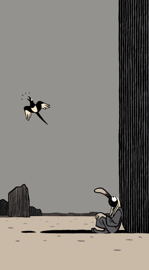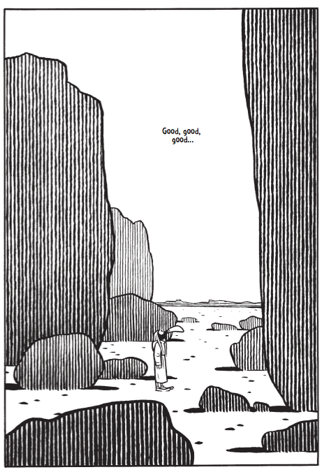 Max’s latest graphic novel translated by Fantagraphics purifies and condenses his cartooning and thinking still further. Vapor charts the struggles and strange encounters of Nicodemos, a long-haired, long-nosed monk, who has quit the ‘gigantic muddle’ of the world to seek transcendence in a desert through self-deprivations. Max admits, “Some people say my concerns are too philosophical, but they grow from plain reality. What can you do if, like me, you can’t stand the world as it is now? What if I leave everything behind, go to the wilderness, stay quiet there, let things flow? Will I find peace of mind, or find a God or something?”