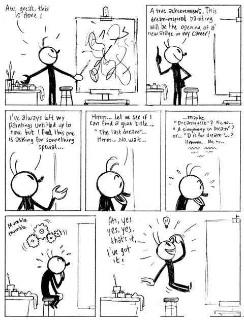 For inspiration for Max’s new untitled Strip for ArtReview (rough and finished colour comic, below), he ponders his mixed experiences of the art world and its tendency for po-faced self-importance. In his view, “The ‘visual’ look of comics has been assumed as a trend, as part of ‘pop’ and ‘pulp’ aesthetics. But the core of comics is telling stories through visuals, whereas contemporary art seems uninterested in stories, it is just interested in theories. And it wants to be ‘serious’. There is a huge cultural prejudice against fun. If something is fun, it can’t be taken seriously.” Contradicting this, the vehicle of comics permits Max to blend the playful and the profound into a metaphysical tour de force.