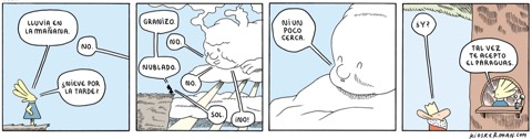 “The strip format doesn’t belong to newspapers. It is simply a short format and people should do with it whatever they please.” This call-to-arms from Kioskerman, pen-name of Pablo Holmberg, is precisely what the internet enabled him to try when he began his weekly webcomics in 2004. Born in Buenos Aires in 1979, Holmberg avoided using the regular, merchandisable characters and undemanding, repetitive formulas which some cartoonists have traditionally relied on to maintain the productivity and public appeal of their daily episodes. The conventional gag-a-day or cliffhanger narrative of a strip might seem too confining, but in Holmberg’s hands four square images, clustered two-by-two, relate and resonate with each other to become an underlying rhythm and leitmotiv. In their duality and parallelism, the words and pictures in Edén reinforce each other rather than decorate each other. By stretching this apparently simple format to new limits of emotion and depth, Holmberg demonstrates that it offers more than enough space to build up over time into a world of ideas and feelings.