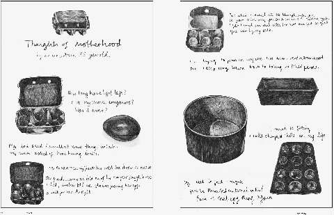 Brought up within an extended Jewish family, Lightman sees her artwork bridging two forms of knowledge - learnt and experienced, or as she puts it, “History/herstory and my story. In Jewish textual tradition, midrash fills the gaps in Biblical texts. My artwork lives in these spaces, as a visual midrash”. Lightman has found many parallels with her Old Testament namesake, voiceless and barren, who nevertheless bore Abraham’s son, Isaac, late in life. Recently married, Lightman reflects on her uncertainty about parenthood through such spare, evocative imagery as an egg carton and baking tins in her new strip for the May 2013 issue of ArtReview magazine entitled And God remembered Sarah (see below).