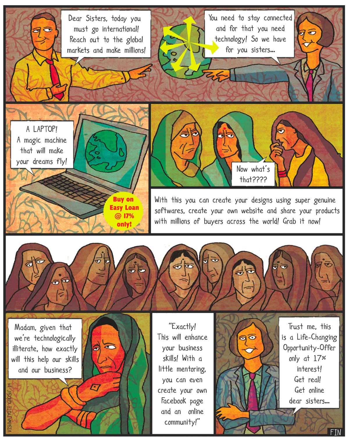 Similarly, more pressing yet under-reported is the targetting by India’s liberal economy of the countryside’s untapped potential. In ‘The Offer’, his new strip for ArtReview Asia (below), Ghosh highlights how “brands are moving in deeper, connecting the rural masses to the global world. The word ‘rural’ now has sex appeal and the chase is on to corner this emerging market.”