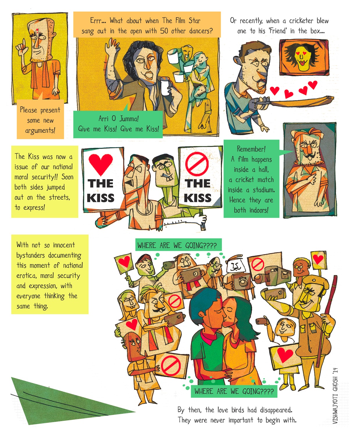 Miss The Kiss, Ghosh’s recent comic for Sunday newspaper India Express (below), critiques India’s recent conservative furore over the morality of kissing in public. “This non issue has become a national one, as if one’s social fabric is under threat”, comments Ghosh. “One day it’s girls wearing denim jeans, the other it’s Valentine’s Day, and kissing the day after. This unfortunately will go on, but young people are finding a way to reply, protesting against this diktat by kissing in the open. These initiatives convey a sense of hope. In a nation of a million problems, where a graduate girl gets killed by her own family for marrying a boy of another caste, are these really issues worth fretting over?”
