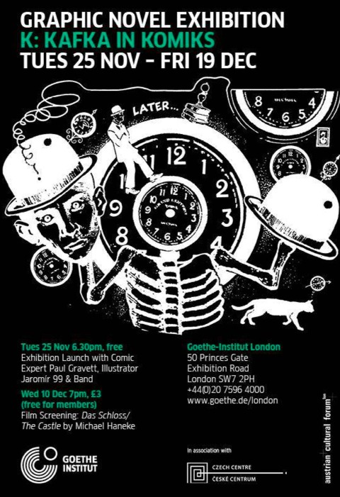Czech artist Jaromir 99, illustrator of David Zane Mairowitz’s adaptation of The Castle by Franz Kafka, is in London tonight at the Goethe Institut in South Kensington. He will be in conversation with me and later playing live with his band, as part of the launch party for an exhibition about graphic novel versions of Kafka’s writings. All are welcome, refreshments with be served, with thanks to the Czech Centre and it starts at 6.30pm. Hope you can make it! The exhibition, K: KafKa In KomiKs continues till December 19th in the Goethe Institut library.