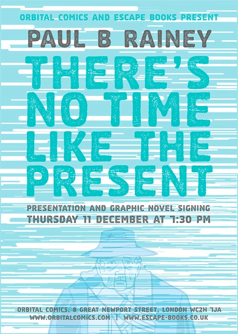 ‘This moment has been a long time coming.’ Tomorrow, Thursday December 11th, Paul B Rainey is previewing his acclaimed graphic novel There’s No Time Like The Present, revised, toned and collected into a handsome hardcover edition with dustjacket from Escape Books. He’ll be signing advance copies of the book from 6.30pm at Orbital Comics, 8 Great Newport Street, London WC2H 7JA, right next to Leicester Square tube, and then from 7.30pm Paul will be talking with Chris Thompson in an illustrated interview about the creation and themes of his epic seven-year serial exploring the mysteries of time. This whole entertaining and edifying evening is free and all are welcome!