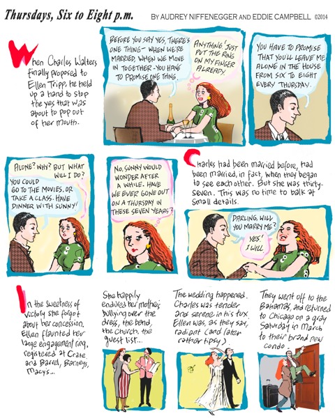 Audrey Niffenegger (The Time Traveler’s Wife) and Eddie Campbell (From Hell) penned a modern tale of love and paranoia, called “Thursdays 6-8pm”: