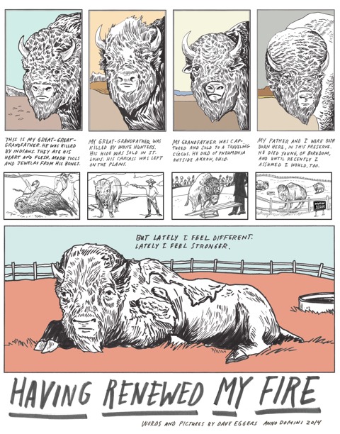Dave Eggers wrote and drew his own comic, a tale of a lonely but impassioned bison, called “Having Renewed My Fire”: