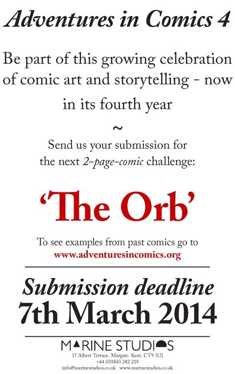 Great news! Adventures in Comics returns for its fourth fantastic year, inviting comics creators worldwide to submit their two-page comics for an exhibition at Marine Studios, Margate, Kent from April 1st 2014 and other venues to be confirmed. As well as appearing on the gallery walls, the best 50 entries will be published in the annual AIC magazine and on the website. The theme this year is ‘The Orb’ and the deadline has been extended till March 7th. So plenty of time to get your submission sent through - best of luck! To get an idea, check out my report on last year’s Adventures in Comics here…