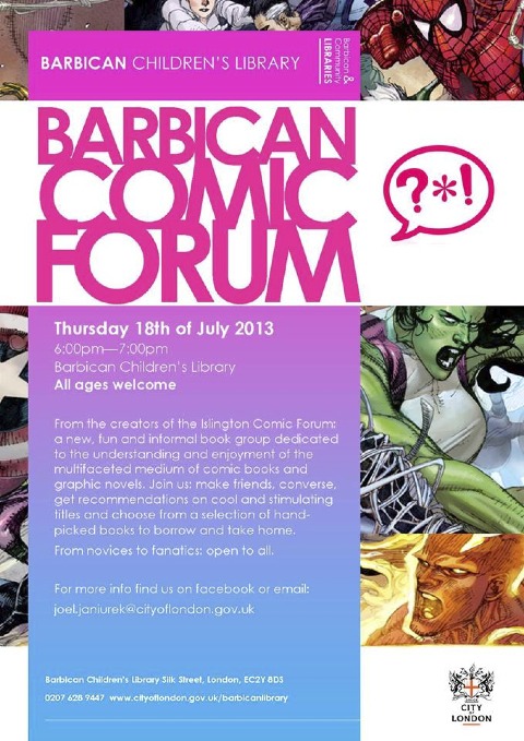 Tomorrow Thursday, July 18th is the grand launching of the free monthly Barbican Comic Forum, run by Joel, ‘Your Friendly Neighbourhood Librarian’ and one of the creators of the Islington Comic Forum. This is a new, fun and informal book group dedicated to the understanding and enjoyment of the multifaceted medium of comic books and graphic novels. Come and make friends, converse, get recommendations on cool and stimulating titles and choose from a selection of hand-picked books to borrow and take home. From novices to fanatics: open to all.