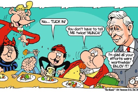 Amid the rather artificial media hullabaloo about Prince Charles and the Duchess of Cornwall appearing in this week’s Beano to promote reading and healthy school lunches, I was called into the studio of BBC Radio 4’s PM Programme with Eddie Mair this afternoon to discuss the state of British children’s comics. Joining me on the phone was Terry Deary of Horrible Histories fame. I managed to give a bit of credit to Leo Baxendale, creator of Little Plum, The Bash Street Kids and Minnie the Minx, sixty years ago this year, and to The Phoenix weekly comics, even slipping in a plug for outlet Waitrose! You can listen in here for the next few days and the piece begins at 51.25 mins into the programme.