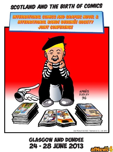 Glasgow and Dundee hosted this year’s five-day double-whammy of the annual International Comics & Graphic Novel Conference and the biannual International Bande Dessinée Society Conference. While absent North American friends Robert Beerbohm and Bart Beaty were much missed, the conference welcomed back plenty of other colleagues in Comics Studies and attracted many first-timers from around the world, notably from Brazil and Turkey, as well as creators like Grant Morrison, who gave the opening keynote, and French guests Tanitoc, Nicola Witko and new Asterix scriptwriter Jean-Yves Ferri. Thanks to the University of Glasgow for letting us see wonderful rarities from their special collections, including a gloriously coloured edition of The Glasgow Looking Glass from 1825, and to Morris Heggie for his selection and tour commentary of a display of Dudley Watkins’ original artworks. I always find the sharing and exchanging of information and ideas at these conferences truly stimulating and inspiring. Thanks to all the organisers and delegates for making this 2013 session such a pleasure.