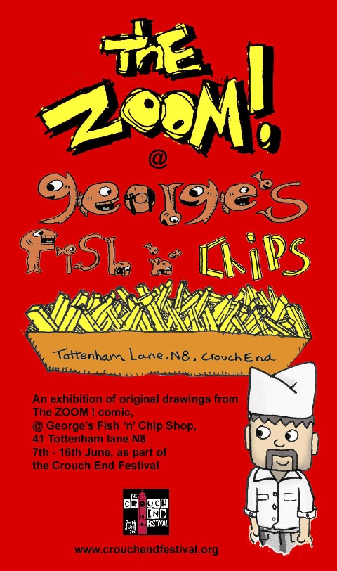The super-talented 11-year-old British comics prodigy Zoom Rockman is exhibiting his original drawings from The ZOOM! Comic as part of the Crouch End Festival till June 16th. Fish ‘n’ chips ‘n’ comics - a perfect combination!