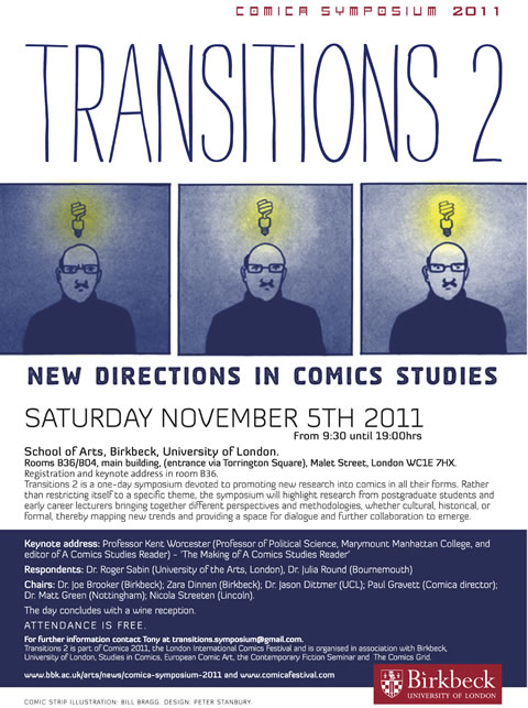 This year’s Comica Festival is upon us now with a packed programme of events, exhibitions, Comica Conversations, lots of launch parties, our Comiket Independent Comics Fair, and much, much more. The schedule is constantly being updated over on the Comica website, but I wanted to alert you to this Saturday’s second Comica Symposium 2011: Transitions II at Birkbeck, University of London, this coming Saturday, November 5th. This conference is academic but accessible, serious but entertaining, bigger and better than last year’s highly successful first foray. There are so many fascinating presentations that ace organiser Tony Venezia has had to run parallel sessions in the morning. And the best thing about it this year is that it’s on a Saturday, so more people can get to it, and it’s still completely free, including wine and snacks from 6-7pm. Yes, there’s still time for you to catch some fireworks after!